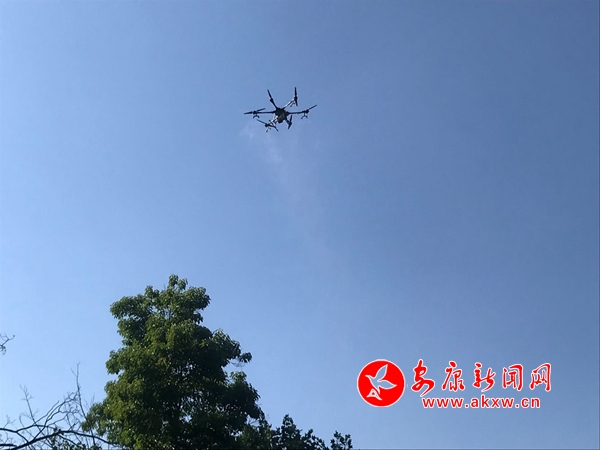 “看,樹(shù)上有駕飛機(jī)”,不知是誰(shuí)高喊了一聲。附近的人們抬起頭就看見(jiàn)不遠(yuǎn)處一架無(wú)人機(jī)在樹(shù)頂上來(lái)回穿梭,“嗡、嗡”的聲響如同蜜蜂飛行放大了幾十倍。只見(jiàn)無(wú)人機(jī)操控員手持遙控器,熟練的指揮無(wú)人機(jī)時(shí)而懸停作業(yè)、時(shí)而緩緩飛行、時(shí)而高空俯沖,黝黑的機(jī)身下拽一條勻稱(chēng)的白色霧帶。