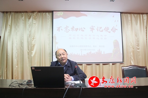 本網(wǎng)訊 10月10日晚上7點(diǎn),安康市中心醫(yī)院召開(kāi)“不忘初心、牢記使命”主題教育專題黨課,醫(yī)院黨委書記、院長(zhǎng)陳文乾以“牢記行政后勤初心使命,實(shí)現(xiàn)區(qū)域醫(yī)學(xué)中心目標(biāo)”為題,從“牢記醫(yī)院行政后勤初心使命、當(dāng)前行政后勤存在的主要問(wèn)題、做好新時(shí)期醫(yī)院行政后勤工作”等三個(gè)方面進(jìn)行專題黨課輔導(dǎo)。院領(lǐng)導(dǎo)班子成員、行政職能后勤人員200余人聆聽(tīng)了黨課。副院長(zhǎng)董根文主持專題黨課。