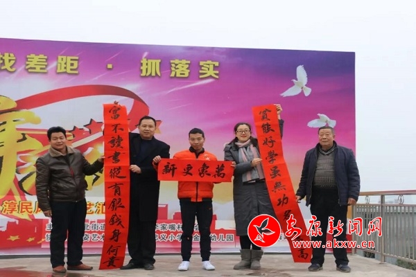 在晏臺村活動現(xiàn)場,幾張桌子一字排開,上面整齊擺放著筆、墨、紙、硯,來自區(qū)內(nèi)的書法愛好者們“老”“少”合作,神情專注,揮毫自如,橫撇豎捺間,濃濃的年味躍然紙上。“正打算買春聯(lián),這不免費春聯(lián)就在家門口,實在太好了,我要把它貼在大門口!”一位村民拿著剛“出爐”的春聯(lián),喜上眉梢。義寫期間,李家嘴村貧困戶李輝生的兒子李強(qiáng),還請書法大師們書寫了自己創(chuàng)作的春聯(lián)——不讀書縱有銀錢身何貴,貧能好學(xué)雖無功名志氣高 。“人窮志不窮,我要用這個來鼓勵我們好好干事,好好為自己的小家打拼。”