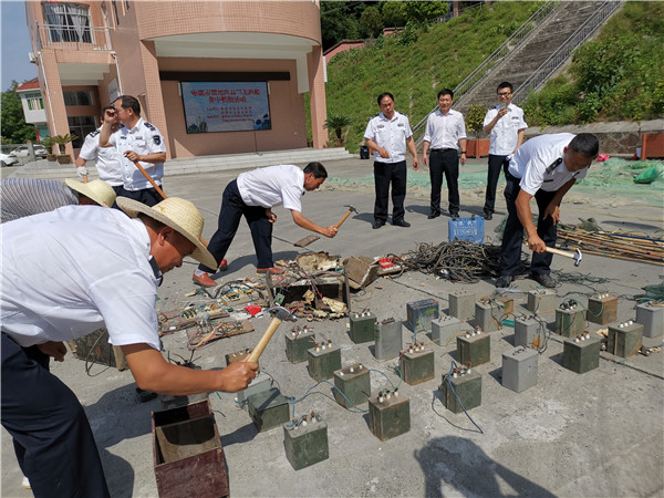 5月22日上午,陜西省農(nóng)業(yè)農(nóng)村廳漁業(yè)漁政局、安康市農(nóng)業(yè)農(nóng)村局在瀛湖海事碼頭聯(lián)合開展禁用漁具及“三無”漁船銷毀活動(dòng),集中銷毀了570余副“絕戶網(wǎng)”共1萬余米,銷毀電魚設(shè)備21套。