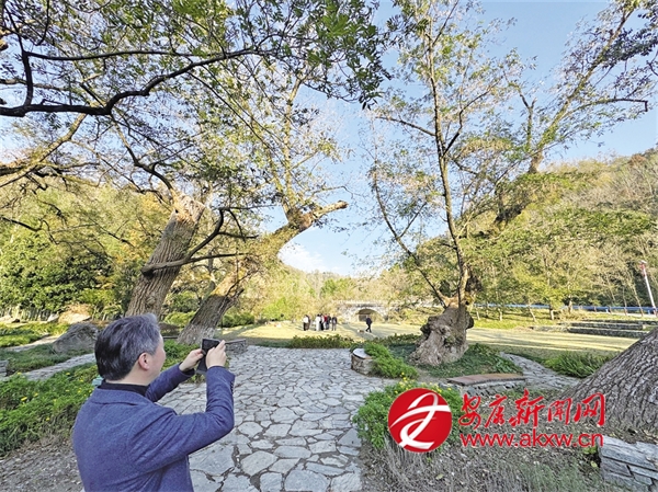 隨后采訪團(tuán)驅(qū)車駛?cè)腚p嶂村,一眼看見(jiàn)高大的“麻柳”古樹(shù)。據(jù)悉,這些古樹(shù)一共16棵,樹(shù)齡約500年。古樹(shù)的枝干或挺拔如衛(wèi)士,或斜臥似老者,繁密的枝葉織成巨傘,將整片草坪籠在樹(shù)蔭里。樹(shù)下游客紛紛舉起相機(jī)拍照,快門聲伴著歡聲笑語(yǔ)。