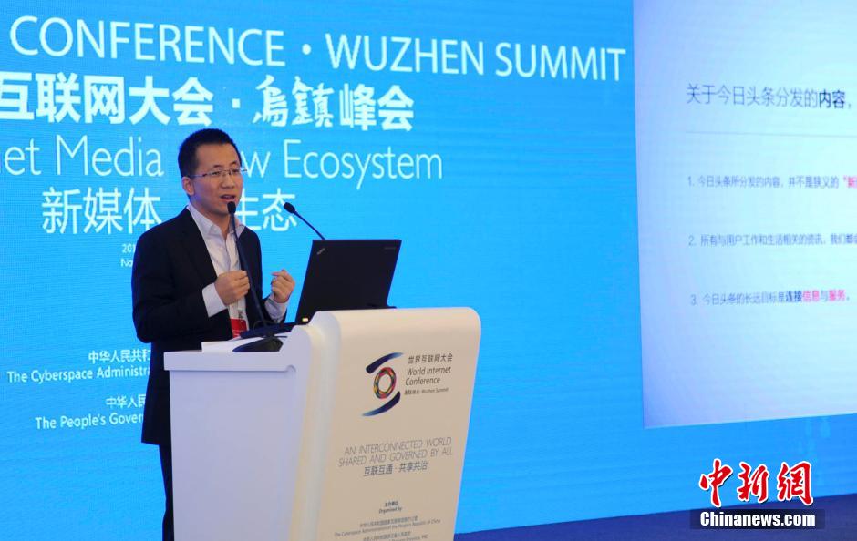 11月19日,今日頭條CEO張一鳴在浙江烏鎮(zhèn)舉行的首屆世界互聯(lián)網(wǎng)大會(huì)新媒體分論壇上發(fā)言。當(dāng)天,世界互聯(lián)網(wǎng)大會(huì)在浙江烏鎮(zhèn)拉開帷幕。 中新社發(fā) 李晨韻 攝aa5安康新聞網(wǎng)