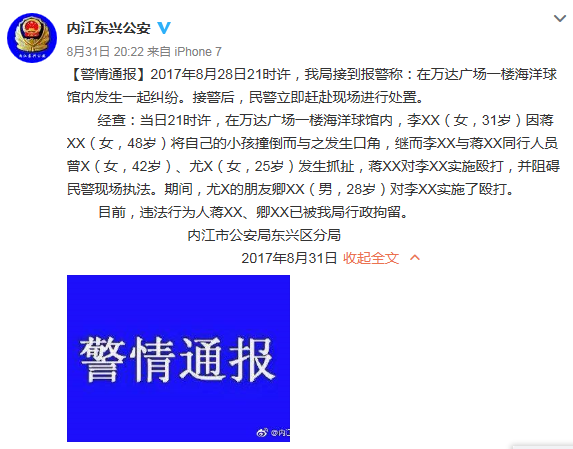 據(jù)8月31日內(nèi)江東興公安發(fā)布的警情通報稱,網(wǎng)傳視頻記錄的實為2017年8月28日發(fā)生在四川內(nèi)江萬達(dá)廣場的一起糾紛。8月28日21時許,警方接到報警稱:在萬達(dá)廣場一樓海洋球館內(nèi)發(fā)生一起糾紛。接警后,民警立即趕赴現(xiàn)場進(jìn)行處置。經(jīng)查,當(dāng)日21時許,在萬達(dá)廣場一樓海洋球館內(nèi),李某某(女,31歲)因蔣某某(女,48歲)將自己的小孩撞倒而與之發(fā)生口角,繼而李某某與蔣某某同行人員曾某(女,42歲)、尤某(女,25歲)發(fā)生抓扯,蔣某某對李某某實施毆打,并阻礙民警現(xiàn)場執(zhí)法。期間,尤某的朋友卿某某(男,28歲)對李某某實施了毆打。隨后,違法行為人蔣某某、卿某某被內(nèi)江公安行政拘留。