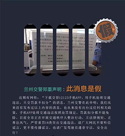 9月14日,蘭州交警通過官方微信公眾號發(fā)布澄清聲明:我們從來沒有發(fā)布過以上內(nèi)容的消息,也從來沒有出臺過任何相關(guān)政策,手機APP處理交通違法應(yīng)按照處罰規(guī)定,罰款扣分都不能免除。