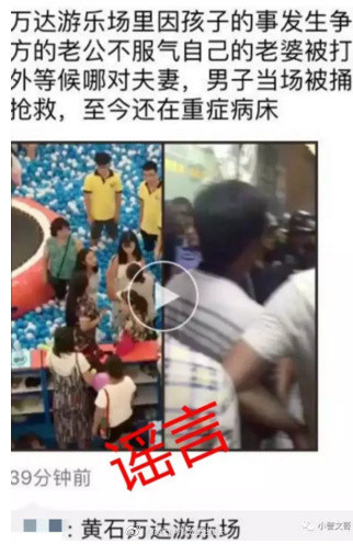 【傳聞】湖北黃石、湖南湘潭、益陽以及山東煙臺等地傳出“在萬達廣場一樓游樂場,兩位母親因為娃娃的事發(fā)生爭吵,隨后,一女子老公因不服氣自己的老婆被打,叫人在萬達外等候里面那對夫妻,男子當(dāng)場被捅死,女的還在搶救,至今還在重癥病床”。
