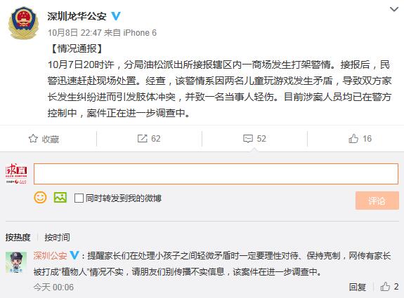 9日0時6分,深圳市公安局官微在這條通報下留言提醒網(wǎng)民:家長們在處理小孩子之間輕微矛盾時一定要理性對待、保持克制,網(wǎng)傳有家長被打成“植物人”情況不實,請朋友們別傳播不實信息,該案件在進一步調(diào)查中。