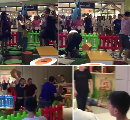 網(wǎng)傳視頻顯示,在一所商場內(nèi)的兒童游樂區(qū)內(nèi),有若干名男子、兩名女子在激烈打斗。另有家長慌忙將孩子帶離區(qū)外,還有工作人員和顧客在驚愕圍觀、勸架。其中一名身穿粉色上衣男子被一名黑衣男子高舉的立方體積木砸倒,俯臥在地,不再動彈。在微博和微信群內(nèi),有人稱打架地點為深圳龍華星河ICO,事情是“兩個孩子搶玩具,引媽媽對罵、對打,然后各自老公打,然后老公朋友打,結(jié)果是某個老公被打成植物人”,引發(fā)網(wǎng)民關注。一些評論惋惜稱“兩個家庭算廢了”,“沖動是魔鬼”。
