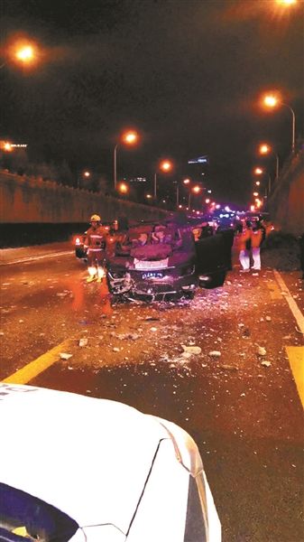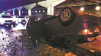 目擊者拍攝的現(xiàn)場照片顯示,這輛黑色小轎車“四腳朝天”摔在農(nóng)展橋下的三環(huán)主路上,車頭及駕駛艙部位受損嚴重,地面上滿是玻璃碎片。農(nóng)展橋橋面一側(cè)的護欄也被破壞,被汽車撞下橋面。