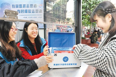 12月10日,上海首個“學雷鋒志愿者服務站”亮相南京路步行街。圖為兩位志愿者在為路人提供服務。