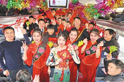 2月8日,是農(nóng)歷臘月二十三,由沈陽(yáng)鐵路局集團(tuán)有限公司沈陽(yáng)客運(yùn)段擔(dān)當(dāng)?shù)腉1226次列車(chē)上張燈結(jié)彩,歡聲笑語(yǔ),“高鐵聯(lián)歡”正在舉行。本次聯(lián)歡會(huì)的7個(gè)節(jié)目全部由乘務(wù)員們自編自演,包括舞蹈、獨(dú)唱、樂(lè)器演奏等,高鐵乘務(wù)人員還給旅客送上了春聯(lián)和福字,讓旅客們度過(guò)一個(gè)歡樂(lè)祥和的小年。圖為表演人員和旅客一起過(guò)小年。(記者 楊青 攝)