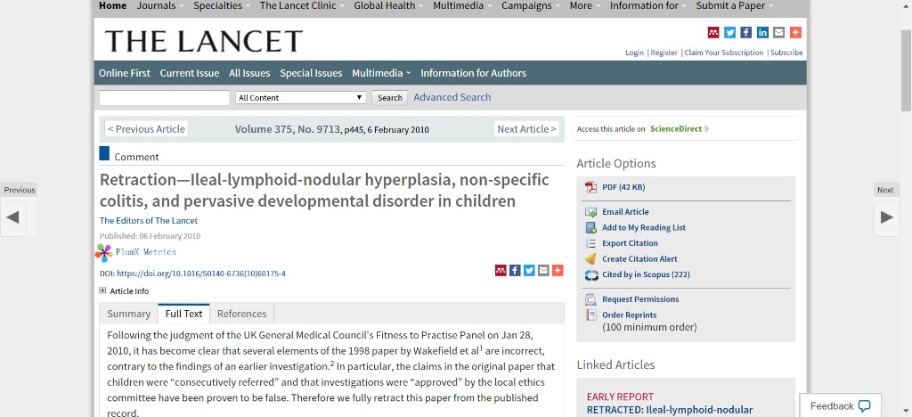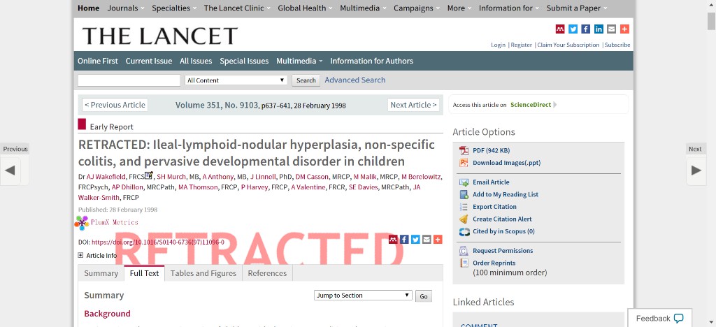 【事實】1998年,安德魯·韋克菲爾德(Andrew Wakefield)在《柳葉刀》(The Lancet)發(fā)表了一篇研究論文,該項研究引發(fā)了人們對麻疹、腮腺炎、風疹疫苗與自閉癥之間可能存在的聯(lián)系的關切,這項研究后來被證實具有嚴重錯誤,2010年,《柳葉刀》對論文實施了撤回。不幸的是,論文的發(fā)表引發(fā)了恐慌,導致疫苗的接種率下降,并隨之出現(xiàn)了相關疫情。沒有證據表明麻疹、腮腺炎、風疹疫苗與自閉癥之間存在關聯(lián)。