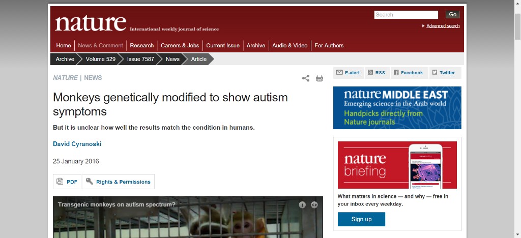 【事實】2016年,《自然》期刊發(fā)表關于“轉基因猴表現(xiàn)出孤獨癥癥狀”的研究論文。該研究由中科院上海生命科學研究院神經科學研究所仇子龍研究組與神經所蘇州非人靈長類研究平臺孫強團隊合作完成。研究通過構建攜帶人類自閉癥基因MECP2的轉基因猴模型以及對MECP2轉基因猴進行分子遺傳學與行為學分析,發(fā)現(xiàn)MECP2轉基因猴表現(xiàn)出類人類自閉癥的刻板行為與社交障礙等行為。