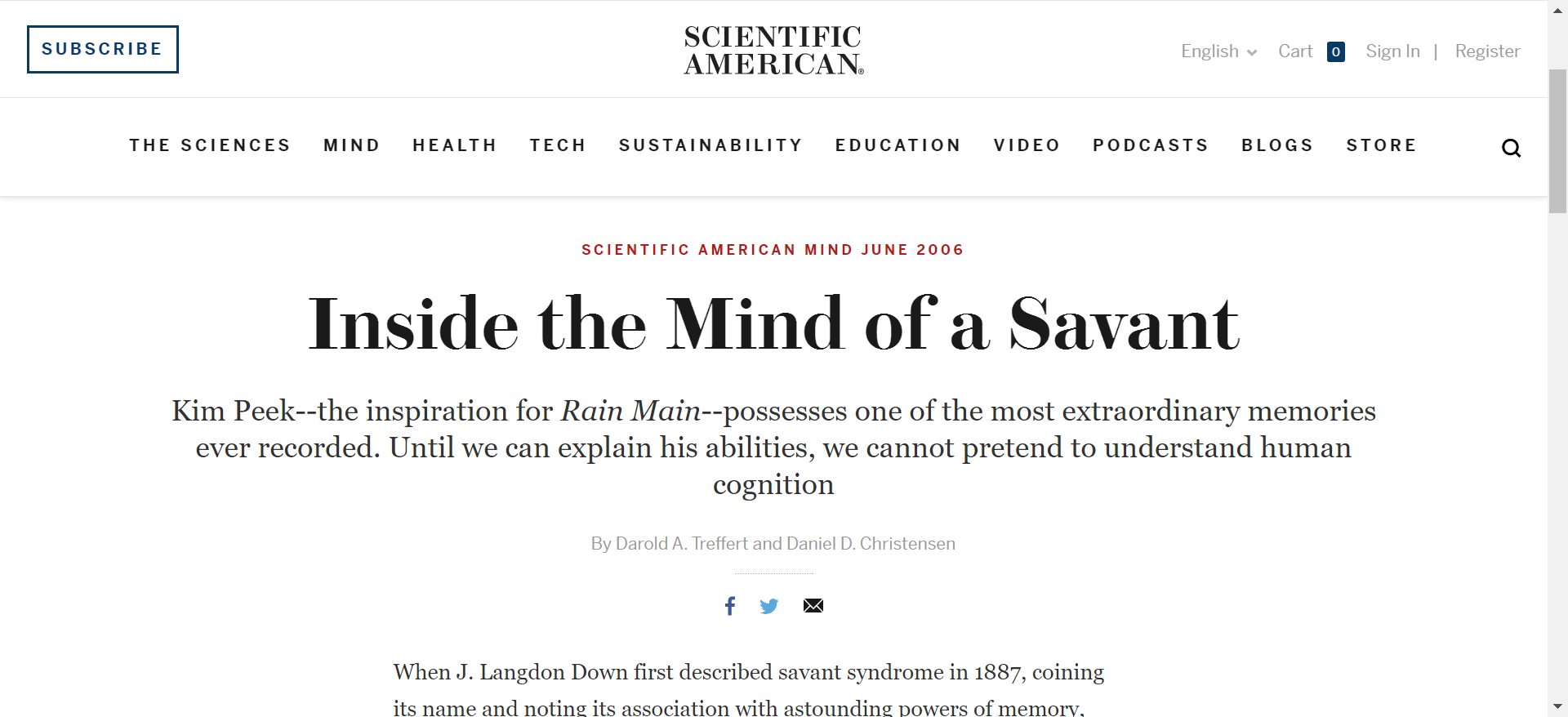 【事實】1989年,《雨人》獲第61屆奧斯卡最佳影片等四個獎項,其中男主角雷蒙的原型人物金·皮克就是一個能背誦上千本書,擁有超常記憶能力的天才。2006年6月號《科學美國人》雜志刊登了《進入“學者”大腦》一文,認為“我們在解釋他的能力之前,不能假裝理解人類的認知能力”。以偏概全,認為所有自閉患者都是潛在的天才是不合理的。