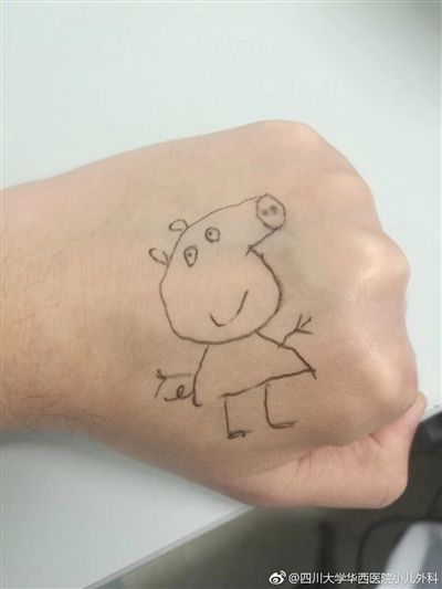 4月7日,四川大學(xué)華西醫(yī)院小兒外科官方微博“四川大學(xué)華西醫(yī)院小兒外科”發(fā)布一條微博,微博中,一位華西醫(yī)生的手上畫了一個(gè)卡通人物小豬佩奇。
