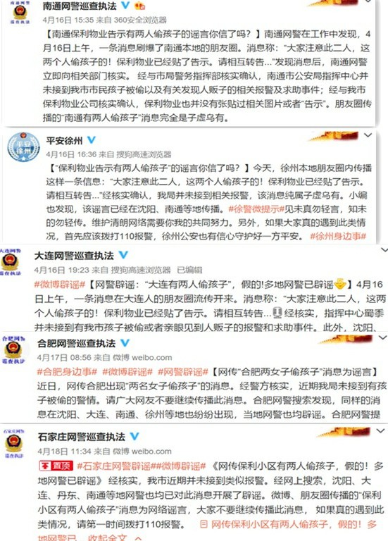4月16日,沈陽網(wǎng)警官微回應(yīng)稱:經(jīng)核實,沈陽市公安局指揮中心并未接到有該市市民孩子被偷或者親眼見到人販子的報警及市民求助事件。丹東網(wǎng)警官微也表示:經(jīng)與該市保利物業(yè)公司核實確認,保利物業(yè)也并沒有張貼過相關(guān)圖片或者“告示”。