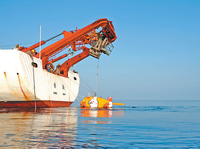 圖為24日科考隊(duì)員在布放“潛龍三號(hào)”,從母船將其放入水中。(記者 劉詩平 攝)