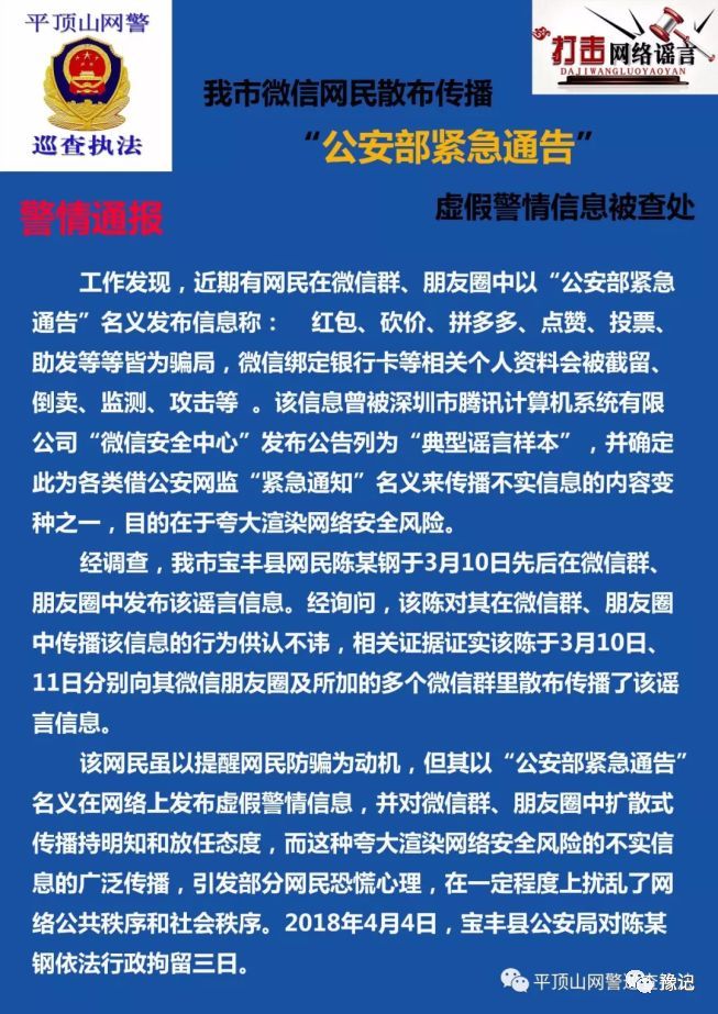 【真相】4月5日,河南平頂山網(wǎng)警官微通報(bào)稱,該市寶豐縣網(wǎng)民陳某鋼與3月10日、11日在網(wǎng)絡(luò)上發(fā)布并傳播上述“公安部緊急通告”的謠言信息,經(jīng)過警方詢問,陳某鋼對其在網(wǎng)上散播謠言信息的行為供認(rèn)不諱,被依法行政拘留三日。