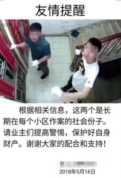 不久前,一段“兩男子試圖入室盜竊”的視頻在微信群和朋友圈中熱傳。視頻中有兩個戴著白手套的男子,一個在撬門,另一個則守在樓梯口把風(fēng)。隨后,正在撬門的男子突然發(fā)現(xiàn)了附近的攝像頭,對另一個穿白衣的男子說了幾句話,最后兩人選擇匆匆離開。視頻中,白衣男子衣服的背后有一處凸起,疑似是其攜帶的作案工具。