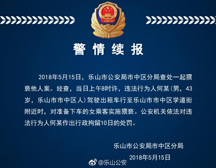 5月15日18時,四川樂山警方發(fā)布警情續(xù)報,2018年5月15日,樂山市公安局市中區(qū)分局查處一起猥褻他人案。經(jīng)查,當(dāng)日上午8時許,違法行為人樂山市市中區(qū)何某,其駕駛出租車行至樂山市市中區(qū)學(xué)道街附近時,對準(zhǔn)備下車的女乘客實施猥褻。公安機關(guān)依法對違法行為人何某作出行政拘留10日的處罰。