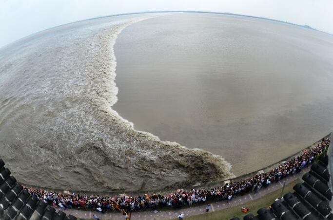 2016年9月18日,記者在浙江海寧市鹽官鎮(zhèn)占鰲塔上拍攝的錢塘江“一線潮”。新華社記者 黃宗治 攝