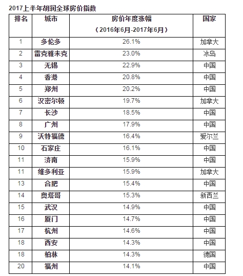該報(bào)告中的房?jī)r(jià)變化對(duì)比的是2017年6月與2016年6月這12個(gè)月以來(lái)的數(shù)據(jù)。除了無(wú)錫排在全球第3位以外,香港排在第4位,鄭州排在第5位,長(zhǎng)沙排在第7位,廣州第8位,石家莊第10位,濟(jì)南第11位,合肥第13位,武漢第15位,廈門第16位,杭州第17位,西安排在第18位。