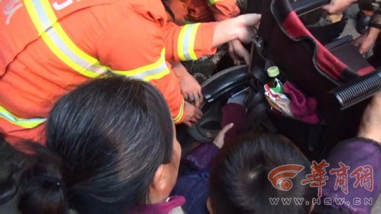 4日下午5時(shí)30分左右,漢中略陽縣一個(gè)小男孩不慎將腳卡進(jìn)了鄰居大叔的輪椅中,周圍的人怎么也取不出來,最終只能求救消防人員。