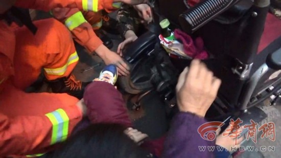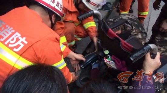 由于這輛輪椅是電動(dòng)輪椅,小孩的腳就夾在輪椅的擋泥板和輪胎中間,要把小孩的腳取出來就得啟動(dòng)電源,這樣更容易給小孩造成更大的傷害,消防人員只能一邊安撫小孩的情緒,一邊想辦法利用工具拆卸電動(dòng)輪椅,將擋泥板和輪子分離開來。