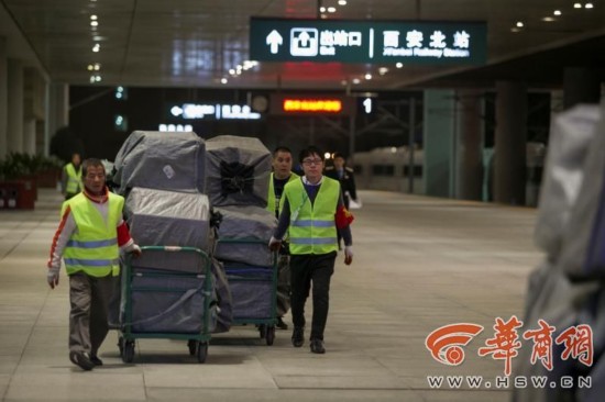 11月11日11時18分,80件累計1000公斤印有“中鐵快運”字樣的包裹箱“坐”上了G1294次高鐵列車,從西安北一路疾馳向大連北駛?cè)。這是今年“雙11”電商黃金周期間西安鐵路局新增大連方向的首趟高鐵快運列車。yrw安康新聞網(wǎng)