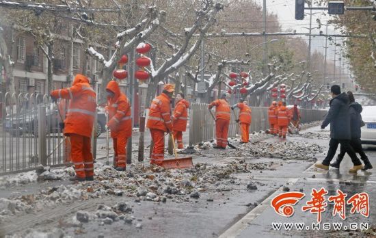 在雁塔區(qū),從1月6日晚至7日14時,5萬余名機關(guān)干部、市容保潔和綠化養(yǎng)護工人以及沿街單位志愿者上街清雪。
