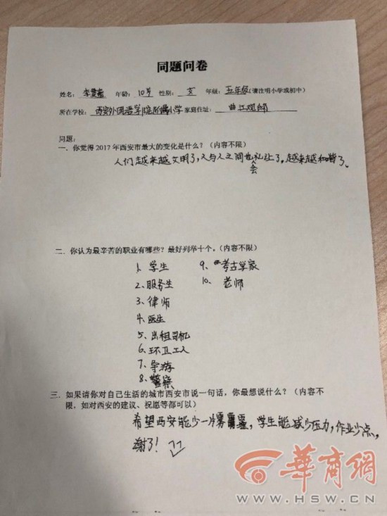 11歲的王慧倩在碑林區(qū)建國路小學(xué)上學(xué),她寫下環(huán)衛(wèi)工人、醫(yī)生,為啥呢?“環(huán)衛(wèi)工人每天起得很早,回得很晚,地上有垃圾他們就得收拾!彼f,醫(yī)生每天都要給病人看病,“很晚的時候,大家都睡覺了,要去找醫(yī)生,醫(yī)生不睡覺要給病人治病!