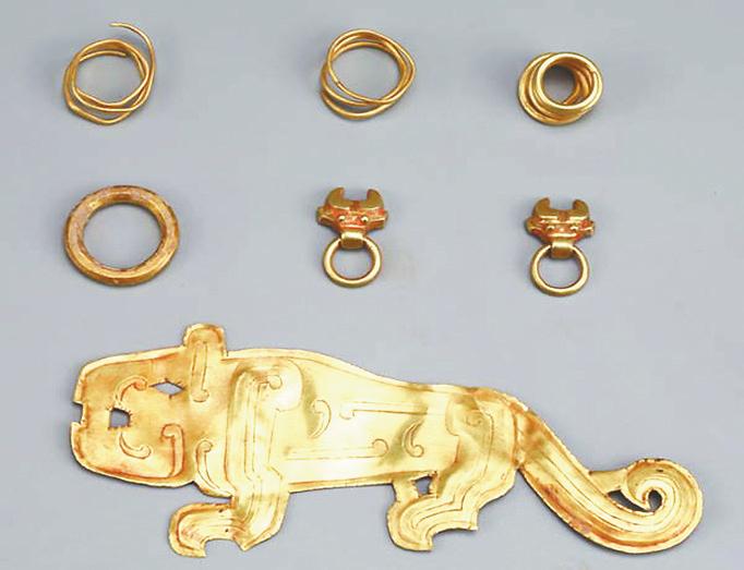 一是鉆探確認(rèn)了墓地的范圍與墓葬數(shù)量,了解了墓葬形制與墓地布局特點(diǎn)。墓地總面積約7700平方米,共發(fā)現(xiàn)墓葬56座,車馬坑2座,馬坑1座。特別引人注目的是兩座“中”字形大墓(編號(hào)M1與M2),東西并列分布,居于墓地中部偏東處。二是對(duì)墓地進(jìn)行全面發(fā)掘,2017年共發(fā)掘墓葬20座,出土了銅、金、鐵、石、玉等材質(zhì)的器物。墓葬多使用木質(zhì)棺槨葬具,墓主人頭向多朝北,仰身直肢。根據(jù)墓葬及隨葬品特征判斷,其年代為春秋早期或略偏晚階段。三是通過周邊區(qū)域系統(tǒng)調(diào)查,找到了與墓地年代相匹配的兩處居址遺存,包括有陶窯、灰坑、板瓦堆積及陶器殘片,以及一處由夯土和壕溝組合成的面積10余萬平方米的核心區(qū)域。根據(jù)采集陶器與板瓦的特征判斷,兩處居址的年代為春秋早中期前后。