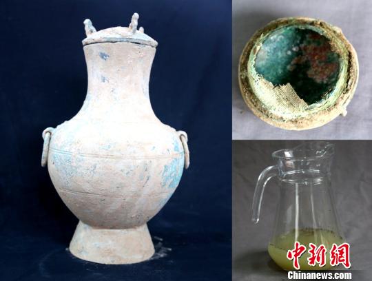 據(jù)介紹,此次出土銅壺的口部以條狀物覆扎有粗布,密封性極好,因此得以保留總量約300毫升的近乳白色透明液體。檢測(cè)后發(fā)現(xiàn),液體中含有較高的羥脯氨酸、谷氨酸等氨基酸以及少量任二酸、月桂酸等脂肪酸等物質(zhì)。其中,羥脯氨酸、谷氨酸等氨基酸的含量分別為4.83ug/g和2.40ug/g,屬于酒類物質(zhì)。