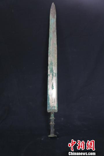 考古人員在一座秦人墓葬中發(fā)掘出土了保存完整的銅劍一柄,通長(zhǎng)60厘米。屬于傳統(tǒng)的“周式”長(zhǎng)劍,一體連鑄,束腰及八面體的劍身有很強(qiáng)的殺傷力。
