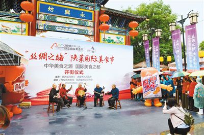 “關(guān)中巷的鄉(xiāng)黨們,陜南街的伙計(jì)們,陜北里的后生婆姨們,擼起袖子加油干,今兒個(gè),咱開市大吉”。昨日上午,記者在永興坊陜西非遺美食文化街區(qū)看到,盡顯老陜豪邁風(fēng)格的“開街儀式”吸引了不少游人駐足。永興坊園區(qū)東邊方言字廣場(chǎng)特設(shè)為“2018‘絲綢之路’陜菜國(guó)際美食節(jié)”主題宣傳區(qū),匯聚了陜西107區(qū)縣的百余種非遺美食和土特產(chǎn)品。