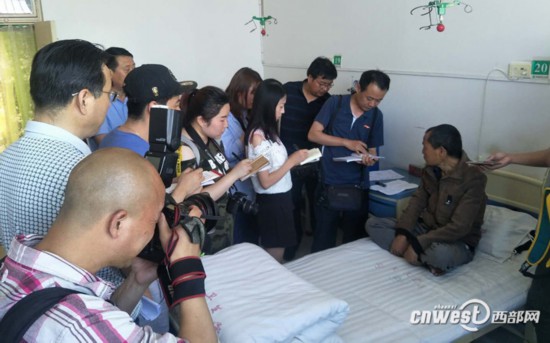 中省媒體健康扶貧采訪團(tuán)采訪正在接受治療的貧困患者董建朝。