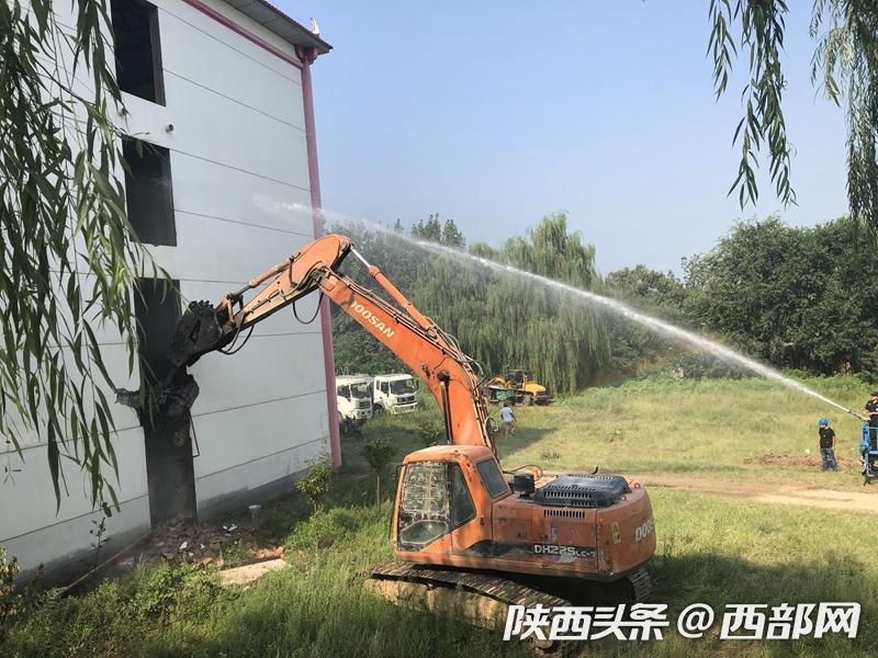 在灤鎮(zhèn)街道灃峪口村,一圈圍墻里的十棟別墅已經(jīng)拆掉了門窗,清理了內(nèi)部裝修,街道工作人員調(diào)集大型機械,集中人力,開始全力拆除主體部分。