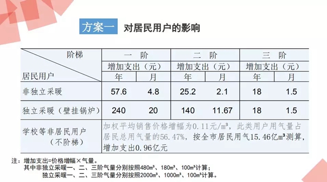 一是非獨(dú)立采暖用戶,按照調(diào)整后的居民用氣一階銷售價(jià)格,一階年最高氣量為480立方米計(jì)算,每戶年增加支出43.2元,月增加支出3.6元;二階最高氣量180立方米氣量計(jì)算,每戶年增加支出18元,月增加支出1.5元,對用氣量達(dá)到三階年最高氣量660立方米以上的用戶,氣價(jià)增幅0.14元每立方米,用氣100立方米,增加支出14元。