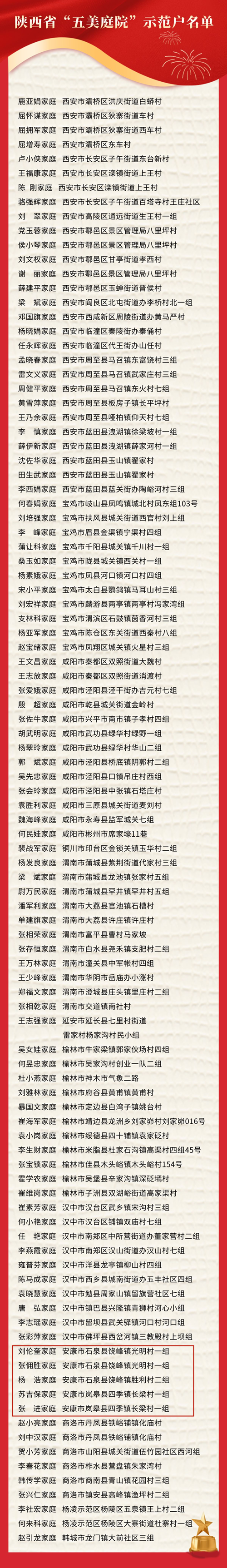 近年來(lái),全省各級(jí)婦聯(lián)堅(jiān)持以習(xí)近平新時(shí)代中國(guó)特色社會(huì)主義思想為指導(dǎo),貫徹落實(shí)全面推進(jìn)鄉(xiāng)村振興的決策部署,深入推進(jìn)“鄉(xiāng)村振興巾幗行動(dòng)”,以“五美庭院”創(chuàng)建工作為抓手,在參與生態(tài)文明建設(shè)、助力脫貧攻堅(jiān)、推動(dòng)鄉(xiāng)村振興中發(fā)揮了積極作用,農(nóng)村人居環(huán)境、鄉(xiāng)風(fēng)文明程度顯著提高。為進(jìn)一步發(fā)揮典型的示范引領(lǐng)作用,省婦聯(lián)首批認(rèn)定西安市長(zhǎng)安區(qū)太乙宮街道四皓村等10個(gè)村為陜西省“五美庭院”示范村,鹿亞娟家庭等100戶(hù)為陜西省“五美庭院”示范戶(hù),現(xiàn)將名單予以公布。