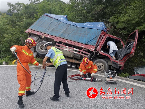 受西漢高速路面養(yǎng)護(hù)施工,貨車實(shí)施交通管制影響, 210國(guó)道貨運(yùn)車輛激增,交通安全形勢(shì)突然嚴(yán)峻。7月17日中午13時(shí)許,一輛倉(cāng)柵式輕型貨車滿載一車貨物,由成都沿210國(guó)道前往河南,行駛至210國(guó)道1392公里+100米處與道路左側(cè)山體碰撞,車頭被撞癟,駕駛員下半身被卡在駕駛室無(wú)法脫困,生命垂危。副駕駛被甩出車外。接警后廣貨街中隊(duì)迅速出警,第一時(shí)間趕到現(xiàn)場(chǎng),迅速組織各救援單位開(kāi)展施救。隨后,醫(yī)護(hù)人員、消防官兵、保險(xiǎn)業(yè)務(wù)員先后到達(dá),四家單位有條不紊地聯(lián)合救援即刻展開(kāi)。交通警察對(duì)事故路段臨時(shí)性實(shí)施交通管制,防止發(fā)生次生事故。同時(shí)配合消防官兵對(duì)卡在車內(nèi)的駕駛?cè)诉M(jìn)行施救。醫(yī)護(hù)人員對(duì)傷員進(jìn)行前期救治,包扎、輸液、輸氧。保險(xiǎn)公司派出救援車輛對(duì)遺散的貨物進(jìn)行收集,對(duì)受困車輛進(jìn)行施救。歷時(shí)兩個(gè)小時(shí),受困人員被救出,送醫(yī)院治療。
